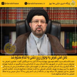 درگذشت صابر کاظمی، ستاره والیبال ایرانرئیس کل دادگستری استان فارس گفت: عوامل تعرض به نوجوان زرین دشتی در دادگاه کیفری یک استان فارس با مجازاتهای سنگین مواجه و عامل اصلی تعرض به این نوجوان به اعدام و ۱۰ سال حبس محکوم شد.