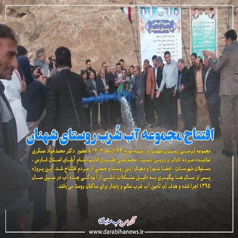 به گزارش دارابیها نیوز، مجموعه آبرسانی روستای شهنان با حضور دکتر محمدجواد عسکری، نماینده مردم داراب و زریندشت و رئیس کمیسیون کشاورزی، آب، منابع طبیعی و محیطزیست مجلس شورای اسلامی، و محمدعلی قلندری، قائممقام آبفای استان فارس، افتتاح شد.