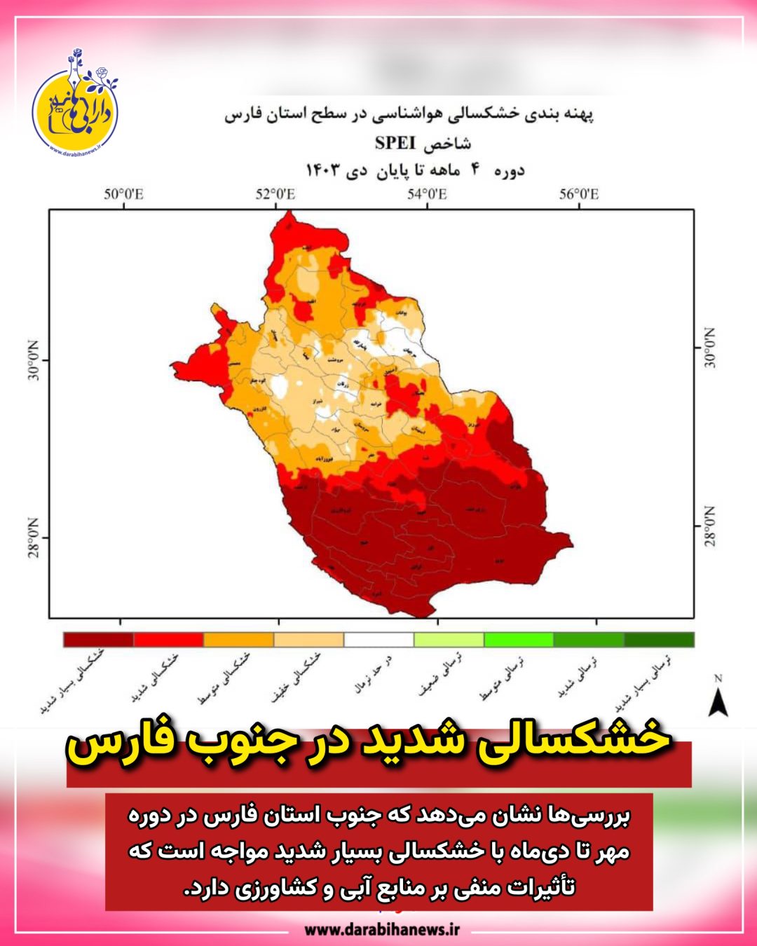نه شیراز قدر دانست، نه داراب؛ قهرمان ملی در میان شعارها گم شد*🔺جنوب فارس زیر سایه خشکسالی* به گزارش دارابیها نیوز، بر اساس پهنهبندی خشکسالی هواشناسی، بررسیهای دوره چهارماهه از ابتدای مهر تا پایان دیماه نشان میدهد که مناطق جنوبی استان فارس با خشکسالی بسیار شدید روبهرو هستند. این وضعیت میتواند اثرات جدی بر *منابع آبی، کشاورزی و معیشت ساکنان* این مناطق داشته باشد. کارشناسان هشدار میدهند […]